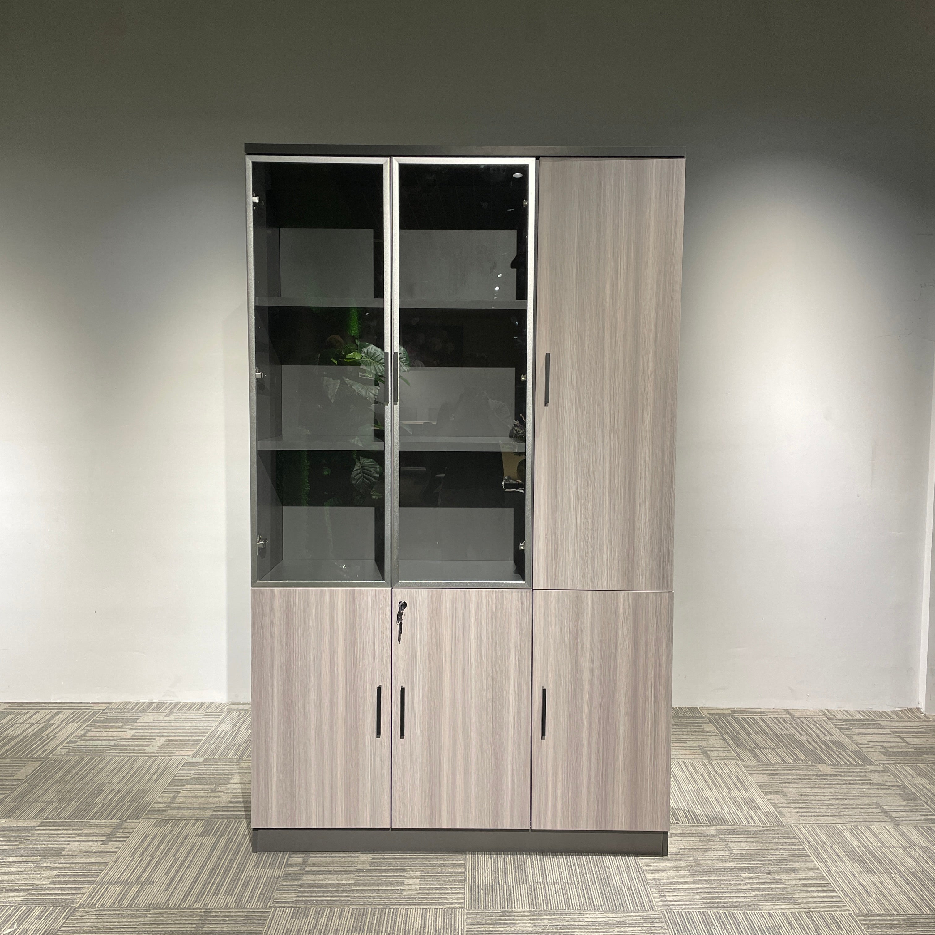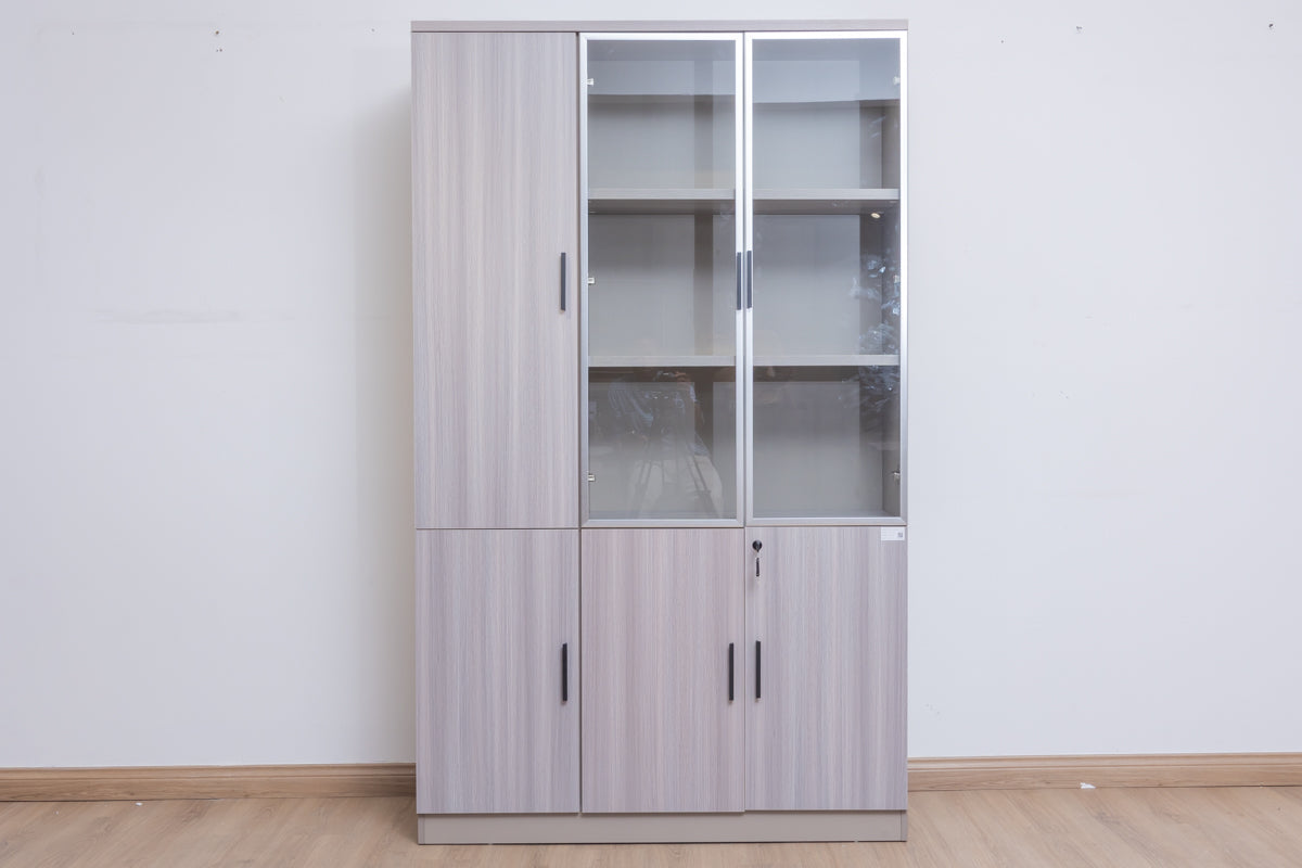 Eucalyptus Office Cabinet with a combination of shelves and glass doors. The upper half has two swing glass doors and a solid door. The bottom half has 3-tier shelves with 3 solid swing doors. RYE is Ideal for storing books, files, and folders on the open shelves and personal items of value in the lockable cupboard.